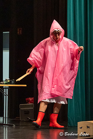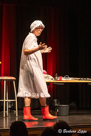 Mit Nachthemd und Gummistiefeln bekleidet betrat Katrin Iskam die Bühne. Denn die gelernte Krankenschwester liebt es, egal ob Sommer oder Winter, morgens direkt nach dem Aufstehen erstmal durch den Garten zu gehen. Immer dabei der neunjährige Dackel Tyson, der dafür gesorgt hat, dass die Wühlmäuse Beete und Rasenflächen nicht mehr zerstören. Gerne berichtet sie auch von ihrem Ehemann Waldemar (Waldi), der am Anfang ihrer Ehe Geld, volles Haar und starke Nerven hatte und nach 15 Jahren Hobbygärtnern nichts mehr davon übrig ist. Die Nachbarn durften nicht fehlen, angefangen bei den Netten, mit denen man auch mal zusammen grillt. Gruppe B sind die Neugierigen, die man nicht sieht, aber immer am Fenster stehen und alles wissen – ihr Tipp: winken und lächeln. Außerdem die Übergenauen, die immer etwas zu meckern haben und sich über alles beschweren. Natürlich durften die Gartentipps in ihrem Programm nicht fehlen. So rät sie, Grablichter in die Magnolie zu hängen, um Pflanzenteile vor Frost zu schützen. Ebenso werden Sträucher und Pflanzen durch alte Bettlaken und Omas Schlüppi vor der Kälte geschützt. Bei neugierigen Nachbarn einfach winken und lächeln.