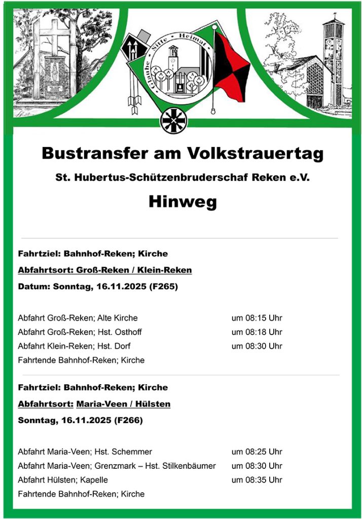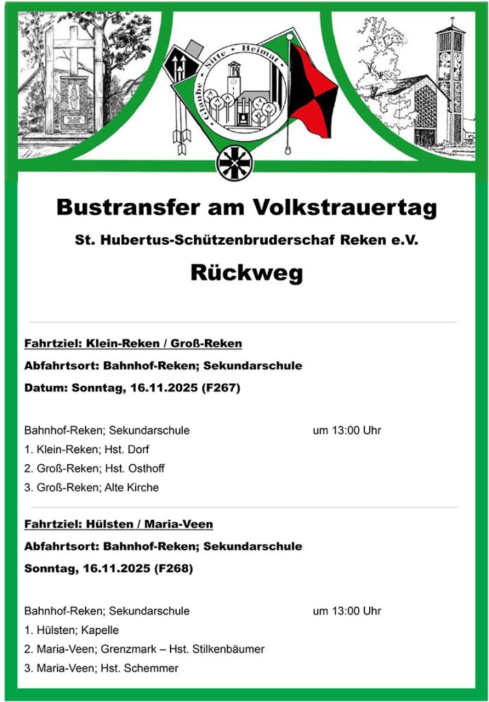 Damit alle Schützenvereine der Gemeinde Reken daran teilnehmen können, wurde ein Bustransfer eingerichtet. Die Veranstaltung beginnt um 9 Uhr mit einer Messe in der St. Elisabeth Kirche. In einem Gedenkmarsch laufen die Schützen unter musikalischer Begleitung durch die Blaskapelle Reken gemeinsam zum Ehrenmal. Zum Gedenken an die unzähligen Opfer durch Kriege und Terror wird ein Kranz niedergelegt.