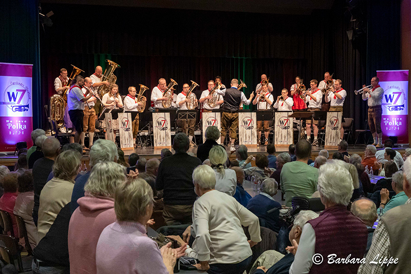 Am Sonntag präsentierten Westfalen 7 & Friends einen abwechslungsreichen Mix aus überwiegend Märschen und Polka, der durch einen kraftvollen Sound gespickt mit leisen Elementen die Zuhörer begeisterte. Mit dem Hochfeiler Marsch von Mathias Rauch stimmten die Musiker das Publikum auf den Abend ein. Zum Programm gehörten Klassiker wie „Böhmische Leckerbissen“ und „Böhmischer Wind“ von Ernst Mosch sowie „Kannst du Knödel kochen“ und „Egerländer Dorfschwalben“ von Ernst Hutter. Außerdem spielten sie die „Rheinlandmädel“ von Willi Ostermann, das konzertante Werk „Concierto de Aranjuez (Solist Reiner Gremme, B-Tuba), das eigentlich für Sologitarre und Orchester geschrieben wurde, und „Weus’d a Herz hast wie a Bergwerk“ von Rainhard Fendrich (Solist Nico Loebnitz, Flügelhorn).
