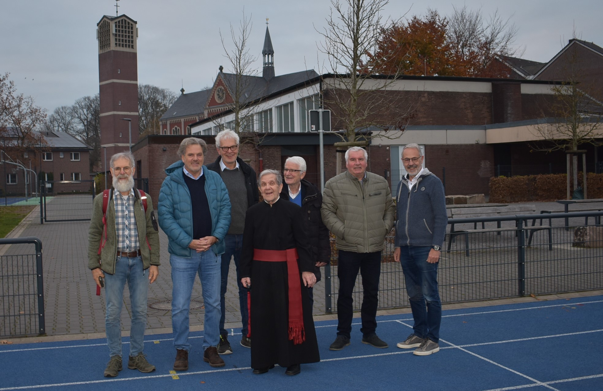 Titelbild: Ehemalige Schüler mit Pater Christoph Beesten vor dem Gymnasium in Maria Veen. Foto: privat