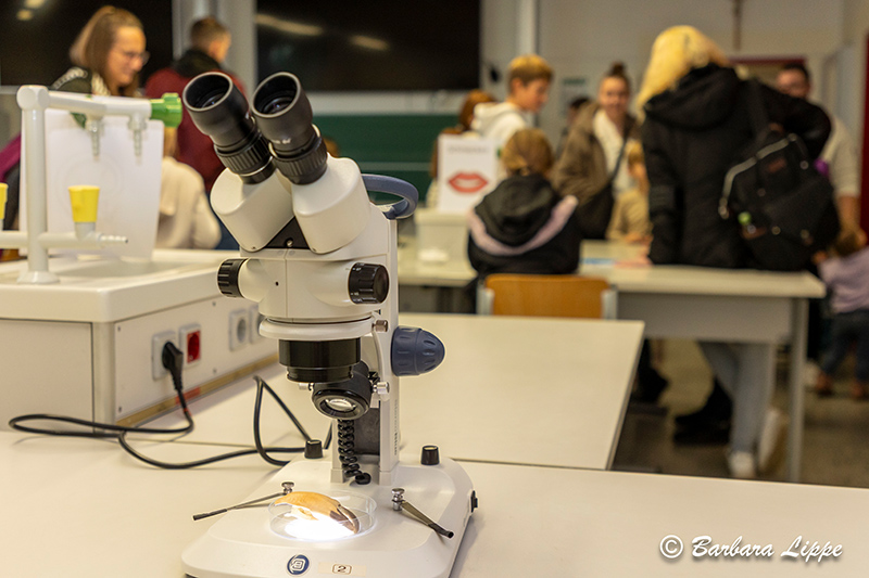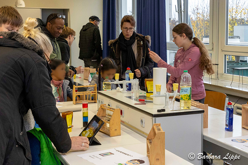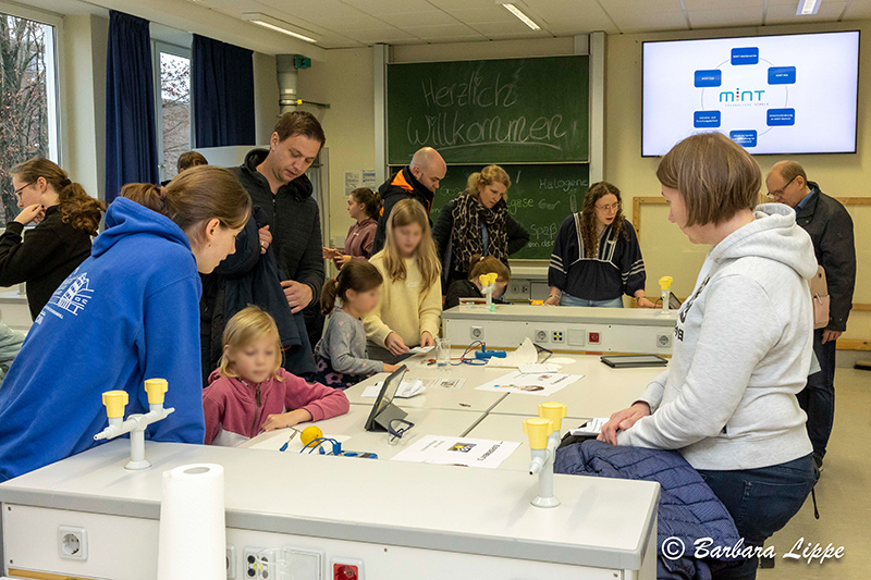 Über das Treppenhaus gelangten die Besucher zu den Fächern Erdkunde, Deutsch, Latein und Spanisch, Kunst und Musik sowie zu den Naturwissenschaften. In den Klassenräumen luden Spiele und Experimente zum Mitmachen ein. Schüler der Oberstufe und Fachlehrer standen Kindern und Eltern dabei mit Rat und Tat zur Seite.