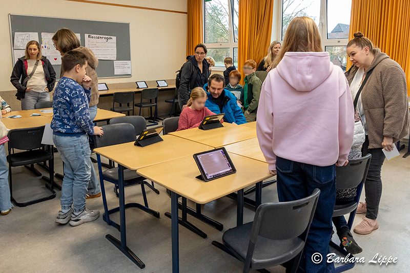 Von dort erkundeten die Familien mit dem Orientierungsplan in der Hand das Schulgebäude, angefangen in der Pausenhalle und dem Schulfach Französisch sowie Informatik im Erdgeschoss von Gebäude A.
