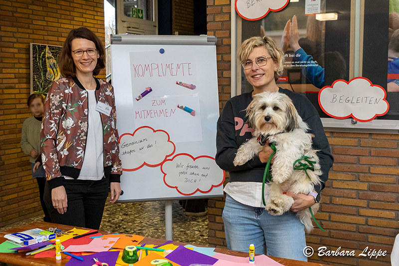 Im ersten Obergeschoss freute sich Pedro über jede Streicheleinheit. Beratungslehrerin Linda Hesse hatte gemeinsam mit Schulsozialpädagogin Claudia Schottyssek und ihrem Schulhund einen Informationsstand aufgebaut.