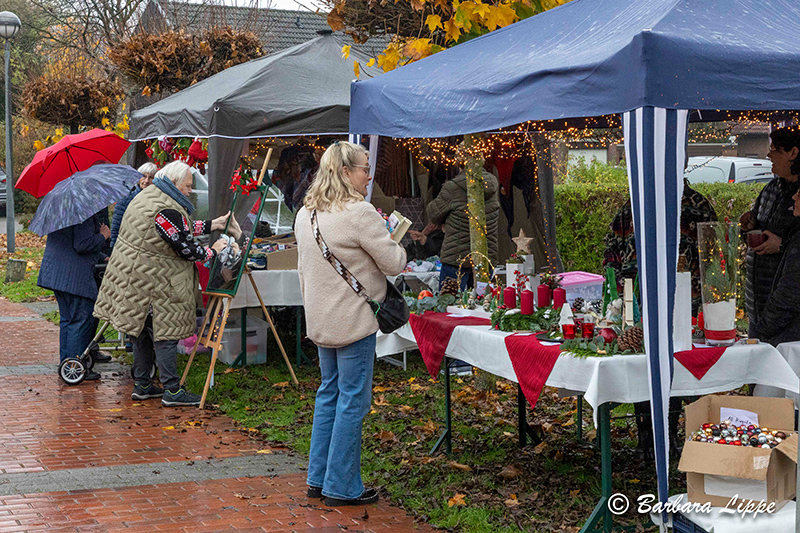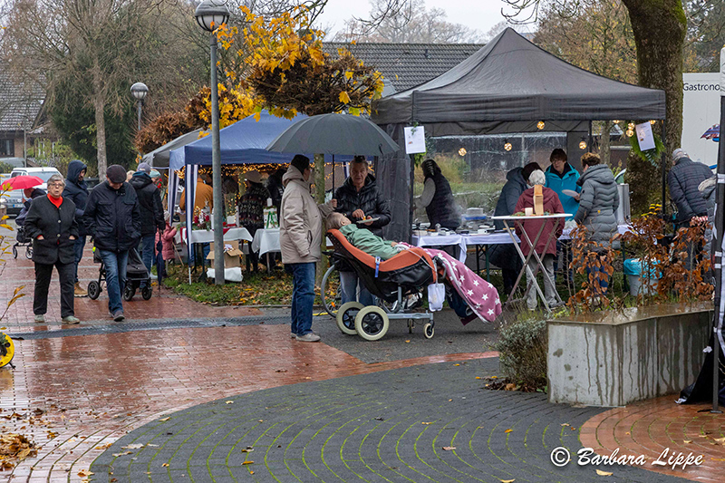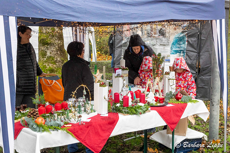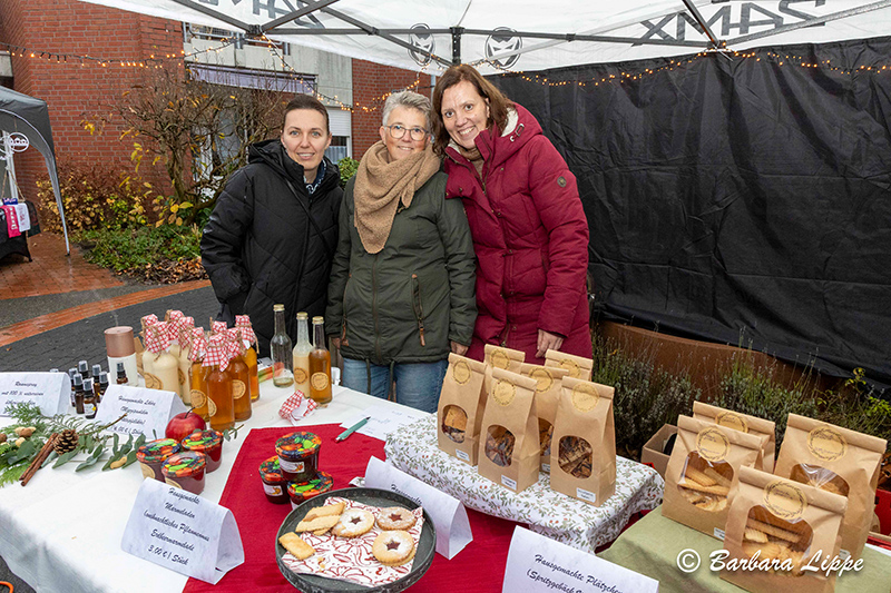Einige Verkaufspavillons säumten den Weg zum Haupteingang. Besonders beliebt bei den Besuchern waren die vom Team rund um Beate Jönen selbsthergestellten Plätzchen, Marmeladen und Liköre. Neben weihnachtlicher Deko boten die Strickfrauen ihre Handarbeiten an, wie Mützen, Schals und Handschuhe. Um leckere Würstchen vom Grill, heißen Glühwein und kühle Getränke kümmerten sich die Männer des Organisationsteams.