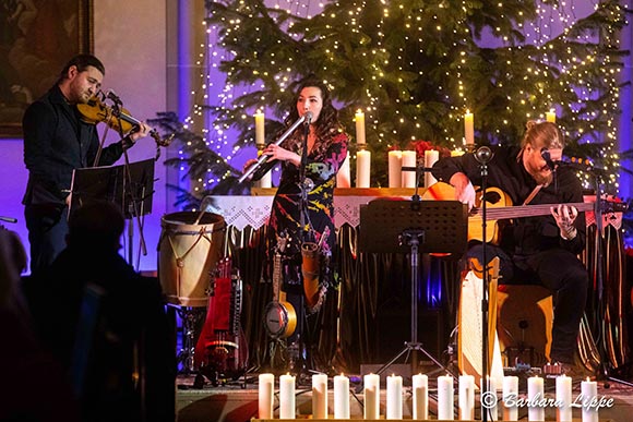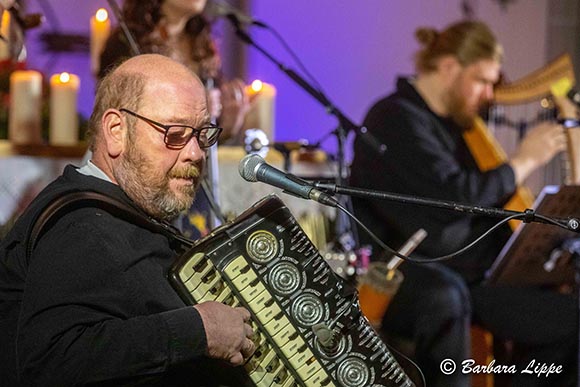 Im Licht der zahlreichen Kerzen erlebten sie ein stimmungsvolles Konzert, das die Herzen berührte. Mit der Lüchterkark-Overtüre wurde das Publikum auf den Abend eingestimmt. Unter dem Motto „Folk meets Classic“ folgte ein abwechslungsreicher Mix aus Melodien zu Winter- und Weihnachtszeit. Die Musiker sangen diesmal sowohl auf Plattdeutsch, als auch auf Englisch und Lateinisch. Das schottische Volkslied „Loch Lomond“ gehörte beispielsweise genauso dazu wie das Violinkonzert von Bach und das Kirchenlied „In dulci Jubilo“. Mit reichlich Applaus bedankte sich das Publikum für den Abend. Erst nach mehreren Zugaben wurde die Band von der Bühne entlassen.