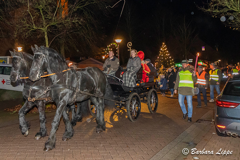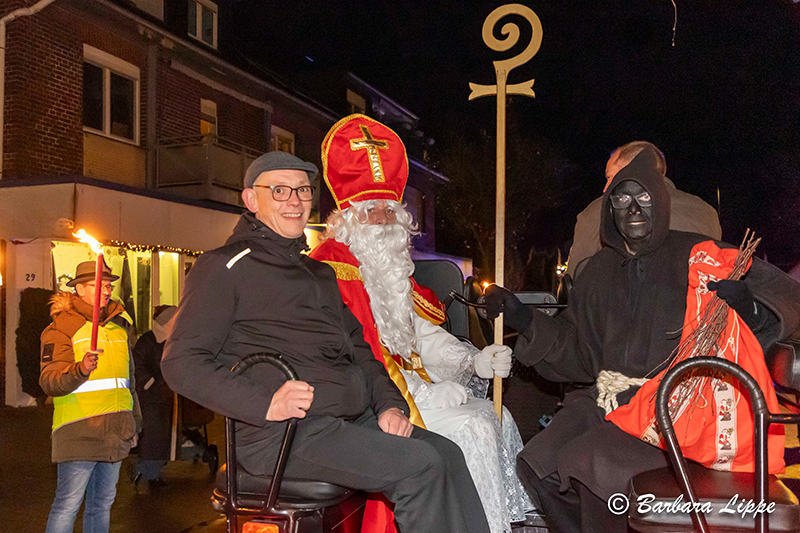 Besonders freuten sich die Kinder auf den Nikolaus und Knecht Ruprecht, die in der Kutsche den Nikolausumzug anführten. Die Fackel tragenden Schützenbrüder begleiteten die Familien. Sie trugen gemeinsam mit der Polizei für Sicherheit der Teilnehmer bei. Für musikalische Unterhaltung sorgte der Posaunenchor der evangelischen Kirchengemeinde. Im Anschluss erhielten die Kinder noch einen Stutenkerl von den Schützen.
