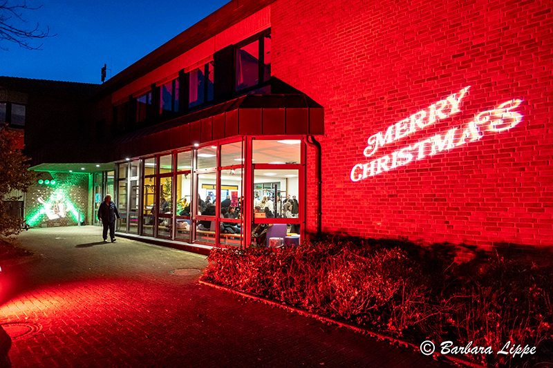 13.12.2025 Bhf. Reken (bli). „Merry Christmas“ stand am Donnerstagabend in leuchtender Schrift auf der Hauswand der Sekundarschule Hohe Mark in Bahnhof Reken.