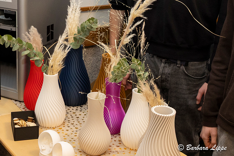 Der Duft nach frischen Waffeln und Crêpe drang aus dem angrenzenden Flur. In den Klassenräumen boten die Schüler viele selbsthergestellte Produkte an. Hierfür hatten Kinder und Jugendliche sowie Eltern fleißig gebastelt und gebacken. Die Designer-Vase aus dem 3D-Drucker von der Schülerfirma „Cut & Print“ kam sehr gut an und wurde mit Begeisterung gekauft. Ein Klassenzimmer hatten die Schüler zu einem Kinosaal umfunktioniert. Davor gab es das obligatorische Popcorn. Außerdem bestand die Möglichkeit, beim Gewinnspiel eines der Schülertrikots zu bekommen. Draußen auf dem Schulhof wurden Grillwürstchen, Pilzpfanne und Stockbrot verkauft.