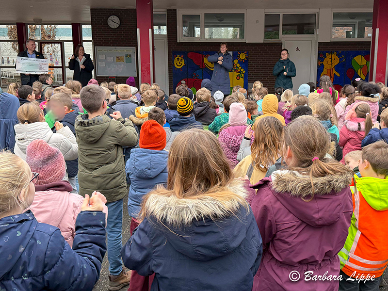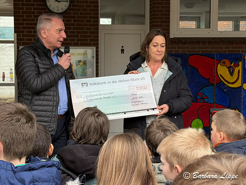 15.01.2026 Klein Reken (bli). Am Donnerstagvormittag wurde auf dem Schulhof der Antoniusschule der Spendenscheck überreicht.