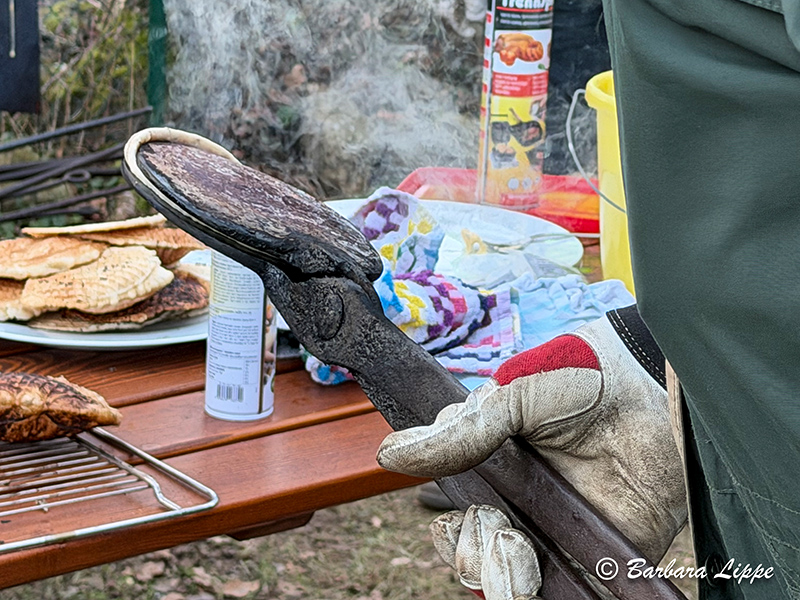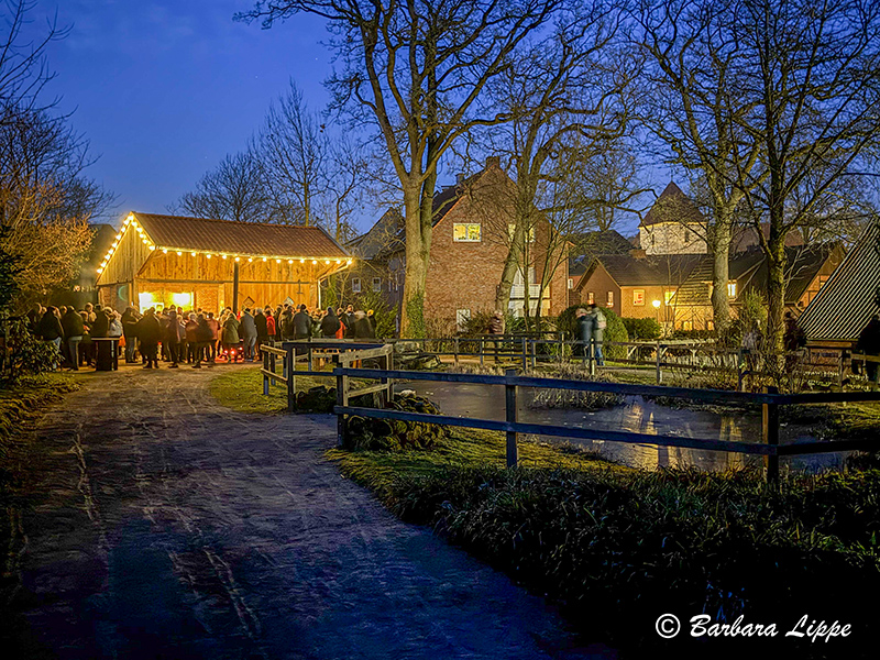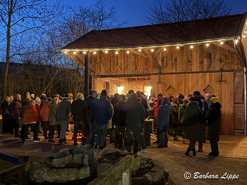 Ab 17 Uhr wurde die Veranstaltung verlagert zur neugebauten Remise. Hier konnten sich die Besucher am großen Holzofen ein wenig aufwärmen. Mit Interesse beobachteten viele die Mühlenbäcker, wie sie Waffeln mit den historischen Waffeleisen über dem offenen Feuer zubereiteten. Zusätzlich wurde mit speziellen Backeisen Piepkoken gebacken, die ihren Namen daher haben, dass beim Erhitzen der Teigmasse pfeifende Geräusche zu hören sind. Außerdem wurden heiße und kalte Getränke angeboten sowie Bratwurst vom Grill. Bis zum späten Abend verweilten die Leute in geselligen Runden an der Remise.