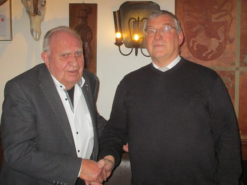 (Titelbild (privat): Versammlungsleiter Bernd Hensel (links) gratuliert Ludger Thies (rechts) zu seiner Wiederwahl zum Vorsitzenden des Vereins zur Ehre ehemaliger Soldaten)
