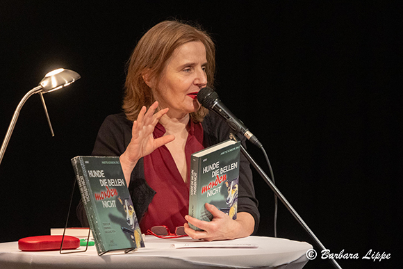 Unter dem Motto „Kurz & Tot!“ präsentierte Krimiautorin und Musik-Kabarettistin Jutta Wilbertz einen Mix aus Lesung und Gesang. Egal ob Kurzgeschichten oder Lieder die Texte bestechen durch ihren schwarzen Humor. Sie hatte eine Auswahl aus ihren Büchern „Upps Tot“ und „Hunde die bellen morden nicht“ mitgebracht. „Du lässt mir keine Wahl, da bin ich radikal, das war dein letztes Ma(h)l“, mit diesem Chanson nach der Melodie „La vie en rose“ von Edith Piaff stimmte sie das Publikum auf den Abend ein. Ein Mord kann überall passieren, egal ob hohe Klippen, ein Streit unter Freunden oder auch im Auto. Es gibt eben die unterschiedlichsten Möglichkeiten, wie man seine unliebsamen Mitmenschen wieder loswird.