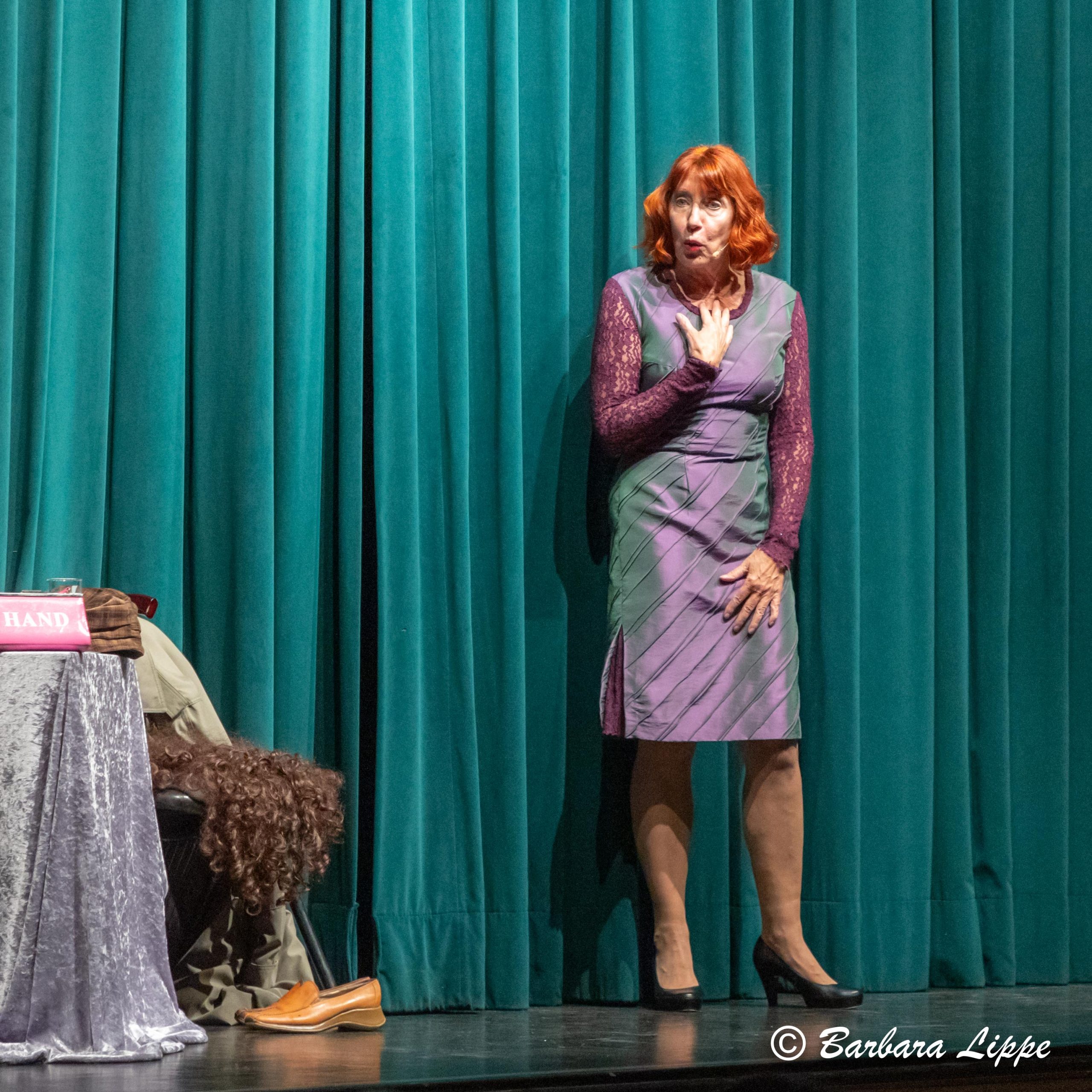 Mit altem Mantel, Hut, Schuhe und Stock verwandelt sich die Kabarettistin in Oma Wally. „Oben fit, unten dicht, mehr wünsch ich mir vom Leben nicht“. Sie erzählte von ihren Mitbewohnern im Seniorenheim, insbesondere von ihrer Frauengruppe „Trockenpflaumen al dente“, die jetzt auch Männer aufgenommen hat. Da sind beispielsweise der George Clooney vom Altersheim, der seine fehlenden Haare mit einem Permanentmarker nachmalt – „hält sogar unter der Dusche“ – und der sportliche Manfred, der in seiner hautengen Sporthose so krumme Beine hat. Oma Wally berichtet ebenso gerne von der Tussen-Oma Brischitte (Brigitte), läuft auf High Heels und hat einen pinken Rollator mit „Schmarotzki“-Steinen. „Die rasiert sich am ganzen Körper. Was soll das? In unserem Alter! Wenn man unten anfängt, sich langsam entfaltet hat und oben angekommen ist, dann kann man unten wieder anfangen.“